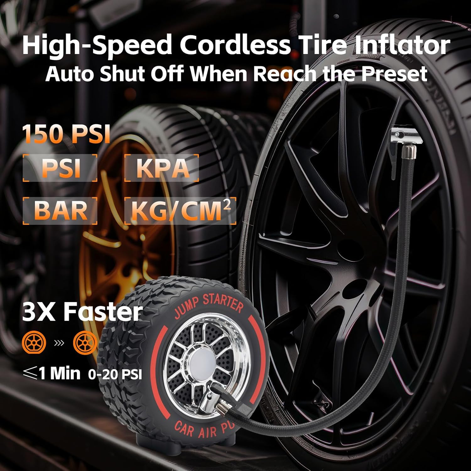- Versatile Air Compressor: Featuring smart preset, real-time tire pressure display, and auto shut-off functions. Its turbocharged 35L/Min (150 PSI) capacity operates continuously for 25 minutes, swiftly inflating a tire to 20 PSI in just 1 minute. It includes 4 different nozzles suitable for cars, bikes, balls, etc., and a large LCD screen for real-time data display.