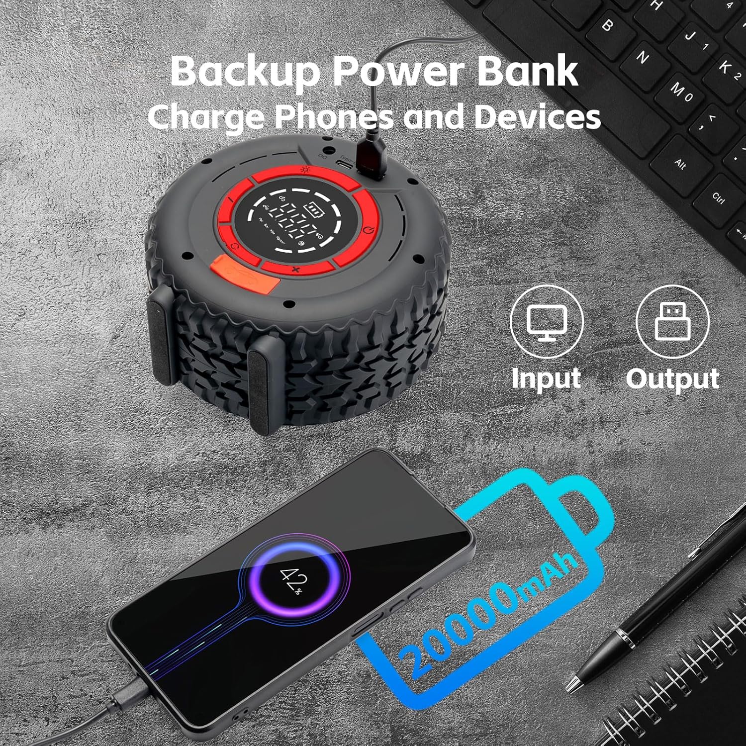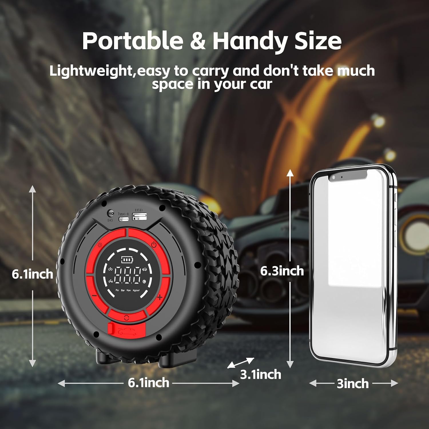 - More than Just a Jump Starter: It is not only jump box, power bank, Tire Inflator, LED flashlight, but also supports 18W Type-c fast charging and 9.8-foot DC 12 V power cord charging. The jump pack takes just ten minutes to charge to fully inflate a tire. In addition, the 400-lumen LED light equipped with the battery starter supports 3 lighting modes: constant lighting (white), flash(red) and SOS(red).